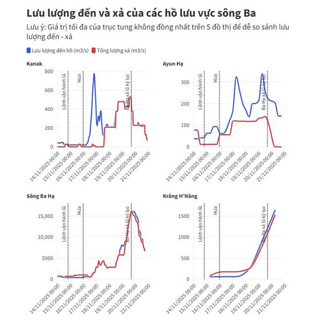 Trong khi, tổng lượng lũ trên lưu vực sông Ba từ ngày 18 đến 21/11 khoảng 2 tỷ m3, theo ước tính của PGS.TS Hoàng Minh Tuyển, nguyên Giám đốc Trung tâm Nghiên cứu Thuỷ văn và Tài nguyên nước, Chủ nhiệm kỹ thuật của nhiệm vụ xây dựng Quy trình vận hành liên hồ chứa lưu vực sông Ba giai đoạn 2010-2014.