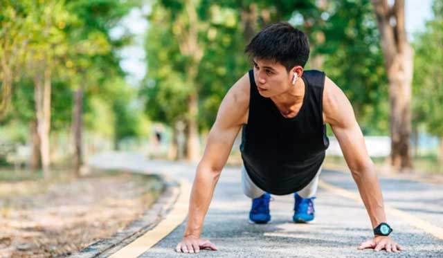 Khởi động kỹ: trước khi hít đất, làm các động tác khởi động nhẹ (xoay vai, cổ tay, plank, plank ngang) để kích hoạt cơ vùng vai - core - lưng.